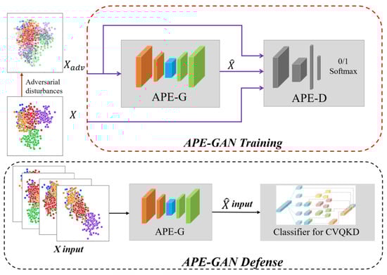 In our experiments, we utilize adversarial perturbation elimination with GAN (APE-GAN), an improved GAN defense model, to eliminate the adversarial perturbations added to the CVQKD system. Some details of the algorithm are as follows: a small enough perturbation ε of the input and that satisfies the following condition can be used to generate an adversarial instance,