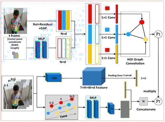 We used graph convolutional networks (GCNs) [43] to generate human–object interaction graphs. Graph convolution is different from standard convolution in that performing graph convolution is equivalent to performing message passing within the graph nodes. The output of the GCN is the updated feature of each object node; all the features of all object modes can be aggregated together for video classification. Formally, we can express the convolution of a layer of graphs as