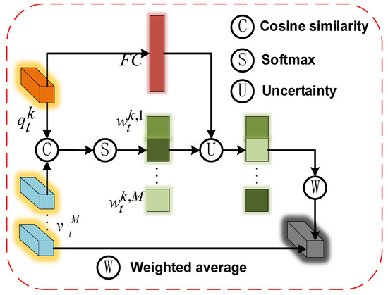 We use the encoder to extract features from the input video frame t to then generate the query map . The size of it is , where are height, width, and the number of channels. denotes individual queries of size in the query map, where . We also use the memory items, which contain M items recording various normal data. The normal data were generated by the encoder of the normal frame containing the people and commodities. The normal frame of the customer was captured at the beginning of the video. We denote the item in the memory using . We calculate the cosine similarity between each query and all items in the memory to obtain a two-dimensional correlation graph of size M × K. By performing a global softmax function, the probability of matching the is obtained. Figure 3 shows the flowchart of the confidence-guided difference enhancement module.