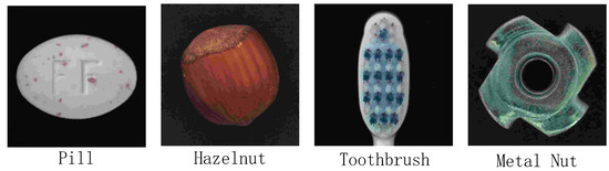 Some presentations from the MVTec AD dataset. It provides pixel-level labeling for anomalous regions, with only normal samples in the training set and normal and defect samples in the test set. Abnormalities include different types of defects such as scratches, dents, contamination, and different structural changes. In our experiments, we mainly use object-type data, which include metal nut, hazelnut, pill, etc.