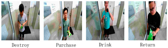 An autoencoder network is a mainstream algorithm for video-based anomaly detection. Deng H. et al. [16] proposed a new T-S model composed of a teacher encoder and a student decoder, and introduced the “reverse distillation” paradigm because of the good performance of knowledge extraction within the unsupervised anomaly detection problem. Piergiovanni A. J. et al. [17] proposed a universal visual backbone which easily adapts a ViT architecture to videos. Due to the fact that smart retail cabinets often capture videos with only one customer, it is better to use action recognition algorithms instead of autoencoder networks to detect abnormal actions. In consumer–action recognition problems, human actions and human–object interactions have an impact on the final consumer action judgment results; therefore, the human–object interaction (HOI) algorithm [18,19,20,21] and video data-based action recognition algorithm can be used for consumer–action recognition. Most existing HOI detection approaches are instance-centric, and cannot capture complex HOI behavior with only appearance features; therefore, Wang T. et al. [22] proposed a novel and fully convolutional version of HOI, and a method wherein HOI detection is posed as the key to solving detection and grouping problems. However, most current action recognition algorithms focus more on human action, which leads to a lack of interactive action information. Meanwhile, the human–object interaction recognition algorithm that can use the interactive action information cannot process the video data, that is, the time information of the action cannot be used. Secondly, abnormal actions that include destroying commodities are the main reason for the commodity loss rate of smart retail cabinets. This is because this type of behavior involves the customer taking the product and damaging it, then putting the product back in its original place. Therefore, this kind of behavior can easily be identified as the customer not purchasing the commodity. This suggests that the boundary between abnormal and normal interaction behavior is difficult to define.