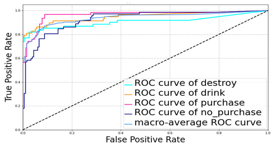The proposed action recognition strategy combines interaction features and temporal features for consumer behavior recognition, and has excellent detection accuracy and generalization ability. Our action recognition strategy not only considers the temporal characteristics of the action, but also considers the interaction characteristics in a single video frame. The results show that the action recognition module designed using an interactive graph is superior to alternative action recognition algorithms, and the selected video frames show obvious damage characteristics. The ROC curve illustrates the good generalization ability of our algorithm.