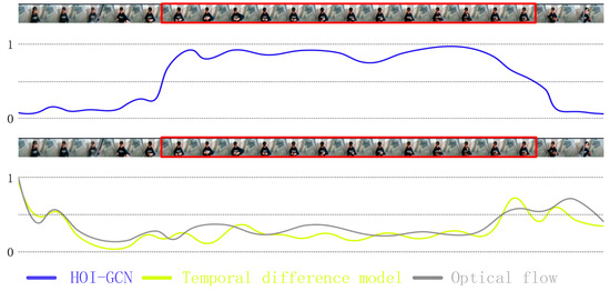Table 4 presents the results. It can be observed from the table that our screening of video frames of destructive action is more effective. The optical flow method performs poorly in experiments; the reason for the poor performance is that the brightness of the opening and closing door changes significantly, due to which the optical flow change when the action occurs is relatively small. Thus, the video frame containing the destruction is not easy to detect. The clustering method has evident differences in the selection effect for different videos, because the optimal threshold selection of different videos is different. After repeating the experiments a few times, we set the threshold to 0.89. Figure 7 presents the experimental results. To detect the broken features, the best keyframe extracted should be the intermediate frame wherein each action occurs. In the experiment, we found that keyframe extraction based on interaction extracts all the keyframes containing related actions and similar actions, which makes the number of keyframe extractions extremely large and scattered, which is not conducive to the detection of broken features. With the addition of motion analysis, the number of keyframes was significantly reduced, and the selected keyframes were concentrated near the intermediate frame in which the action occurs.