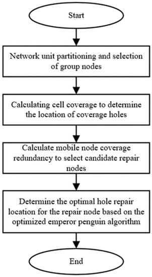 In this section, we come up with a detection and repair approach to address the coverage problem of hybrid WSNs. The approach is organized into two parts. In the coverage hole detection part, for the purpose of facilitating the management of hybrid WSNs, the region is classified as cells on the basis of the quantity of nodes deployed in the region and the nodes’ own sensing range. The group node within each cell is selected according to two parameters: the residual energy value of the static node and the average distance value from the node and the BS, which is responsible for aggregating the data information of the group and then forwarding it to the BS. Then, according to the quantity of target points covered by the nodes in each cell, the coverage ratio of the cell is calculated and the cell ID location covering the hole is determined. In the blind zones’ repair part, the coverage redundancy of mobile nodes in the area is calculated and based on the node redundancy level; then, a suitable mobile node is selected as a candidate repair node responsible for repairing the hole. Finally, a multi-objective fitness function is established, and the final repair location of the repair node is determined using the optimized emperor penguin algorithm to complete the coverage repair and optimization.