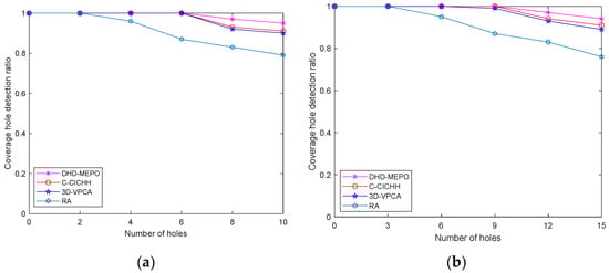 Figure 11a,b shows that the hole detection rate of the different algorithms varies with the quantity of holes in the region. From