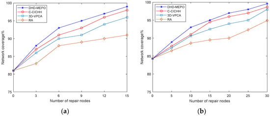 Figure 14b displays that DHD-MEPO is slightly higher than C-CICHH and 3D-VPCA, mainly because in the process of repairing holes, DHD-MEPO will give priority to the hole regions with a high importance level, even though there are hole regions near the current repair node that are a shorter distance to repair. However, the level degree of these hole regions is not high, so it will move a longer distance to repair the region with a higher importance level within the longest distance to which this node can move according to the multi-objective fitness value, so the energy consumed will be high.