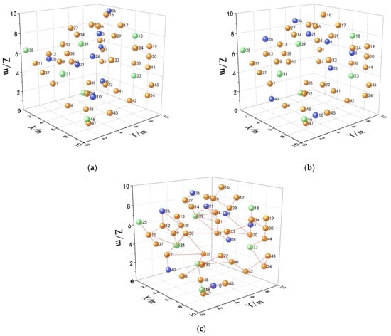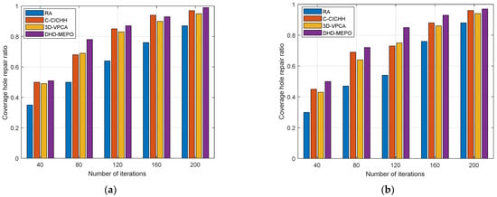 Figure 15a,b, it can be seen that 3D-VPCA performs the worst, C-CICHH slightly outperforms 3D-VPCA, and DHD-MEPO significantly outperforms 3D-VPCA and C-CICHH when considering the overall energy consumption and the uniformity of the mobile node energy consumption. Compared with C-CICHH and 3D-VPCA, a single node’s maximum energy consumption and the nodes’ uniformity of the overall energy consumption are effectively reduced by the inclusion of the energy balance coefficient of the repair nodes as a measure in the multi-objective function setting process, so that all repair nodes will maintain a certain level of energy balance to repair the holes. In contrast, 3D-VPCA and C-CICHH minimize the nodes’ overall energy consumption to some extent, but do not allow for the optimization of the uniformity of energy consumption of the mobile nodes, which leads to the performance differences shown in