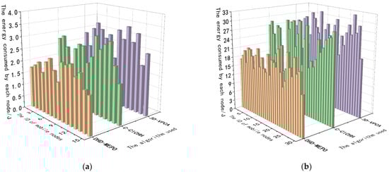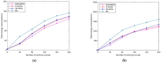 Figure 14a shows that the nodes’ overall energy consumption using the RA algorithm is more than that consumed by the other three algorithms, and the nodes’ overall energy consumption reaches 152.3 J after 200 rounds of operation. The nodes’ overall energy consumption using the DHD-MEPO and C-CICHH and 3D-VPCA methods is approximately equal before the algorithm has been run 40 times. Because the main source of the sensor nodes’ energy consumption in the current network is receiving and sending data information, and the repair nodes have not all started to work yet, the energy consumed by moving the distance to repair the hole is not obvious. The analysis of