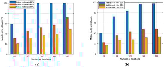 Figure 16 shows that at the beginning when the algorithm works for 40 rounds, the utilization rate of mobile nodes is not high, especially when mobile nodes account for 60% of the total quantity of nodes. Even after 200 rounds of the algorithm, the proportion of mobile nodes effectively repairing holes is less than 50%, so if a large amount of mobile nodes is thrown in hybrid WSNs, not only are the resources of mobile nodes not effectively used, i.e., most nodes will act as static nodes responsible for receiving and sending messages, but there will also be an increase in the network’s cost. After the comparative analysis of the mobile node ratio in