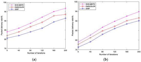 Figure 19a,b shows that the packet delivery rate using the DHD-MEPO algorithm is always in the leading position. The reason for this is that in the initial stage of the algorithm, the network is divided into cells and group nodes are selected for the group management of the cells, and the group nodes are responsible for collecting and aggregating the data information within the cells they manage before sending it to the BS center for further processing. IERP and EMSCOLER do not take into account this aspect of the packet management network area, but the reason why the packet delivery rate is higher with EMSCOLER than with IERP is that EMSCOLER uses a grid concept and selects relay nodes for data transmission in the steady state of the link.