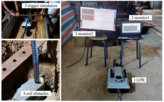 In this work, the prediction models for buried objects in soils were divided into five categories: glass sheets, PVC plastics, wood blocks, dry hard stones, and metal ores. Before burying, the distance from the soil surface to the depth of 5 types of soil obstacle materials was measured, and then, the experimental operation was to attempt detection by dragging the GPR in different soil environments, as shown in Figure 1.