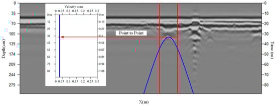 After collecting the GPR data, as shown in Figure 2, we calibrate the speed by first acquiring the time window parameters. Next, we adjust the blue curve in the figure by clicking on the vertex position of the parabola with the mouse and performing shape fitting. By doing so, we obtain the precise propagation speed of electromagnetic waves in the soil and the depth location of the abnormal signal.