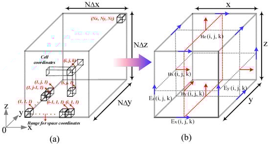 The basic idea of FDTD is to use a central difference quotient to replace the first-order partial quotient of field quantity with respect to time and space. It can directly simulate very rich electromagnetic field problems with time domain information, and simplify the complex soil layer medium physical process into a mathematical difference or electromagnetic format parameters [38]. When solving the actual model, the relationship between field quantities obeys the six rotation equations of the Maxwell equation. In this way, geometric space problems can be solved by separation into orthogonal spatial grid points. The electric and magnetic fields were classified and placed in spatially discrete positions with excitation sources. Therefore, FDTD relies on Maxwell’s principle to decompose its discrete three-dimensional geometric structure problem in the medium into Yee units. As shown in Figure 3, H (A/m) represents the magnetic field strength; E (V/m) represents the electric field strength; where i, j, k represents a three-dimensional coordinate position in space.