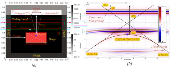 The SVM’s training process used python 3.7 and the model name is “ScikitLearn”, which is a machine learning library in python [40]. The total size of the FDTD 3D model is set to 240 × 210 × 120 mm, and the base model is set to 240 × 210 × 2 mm, which represents the X, Y, and Z directions, respectively. In the 3D model, we divide the data model into 24 slices, the total time depth is 32.21 ns, the distance depth is 0.4 m, and the number of samples is 148. The velocity of the model is 0.025 m/ns, the effective time window is 88.66 ns, and the binary value is 128. The soil’s object position prediction from GPR images can be converted to an image processing problem. As depicted in Figure 4, the output is produced by gprMax’s B-scan module and the objects in GPR images are identified based on the propagation of pulse signals, resulting in features such as hyperbolic curves, linear segments, and electrical impedances. Figure 4a below shows a schematic diagram of the detected soil objects generated by ParaView 5.6.0 (regular-shaped rectangular parallelepiped as an example). According to the procedures described in Section 2.1, we composed the FDTD grid space by electromagnetic field as a cube of 0.240 m × 0.20 m × 0.002 m. The rectangular frame forms a perfect matching layer (PML) with a thickness of 0.02 m. Where the label “Air” means an air layer with a height of 0.03 m. The simulated radar transmitter probe is marked “TX” and the receiver probe is marked “RX”. The length, width, and height of the object are known. The B-scan GPR image in Figure 4b exhibits a hyperbolic pattern that can be characterized by various parameters. represents the horizontal position of the apex and the vertical position of the apex can be equal to (0.17 m − +). Point P is the coordinates of the hyperbolic vertex. represents the slope of the hyperbola asymptotes. is the depth from the top surface of the object to the ground, and is the distance from the hyperbolic apex to the upper surface of the object. Points A (a1, b1), B (a2, b2) and in Figure 4b belong to the geospatial coordinates system.