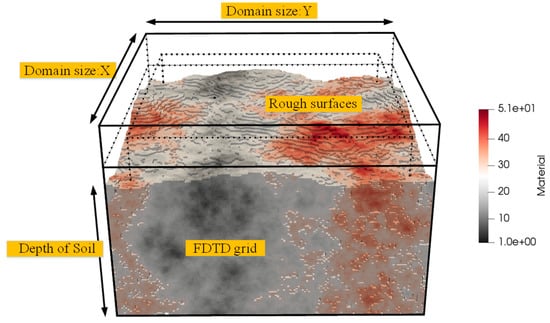 where is the gray value function. Obviously, according to the distribution between , we can estimate the object hyperbolic vertex position.This can be defined as , where is the number of traces in the GPR image. Where and . is the depth perpendicular to the ground, which is measured as the length of the time windows. The range of the belongs to . When the gray image is obtained, we mark the hyperbola vertices P in the hamming distance of the coordinate system and encode them into a binary image. The general steps can be divided into: (1) Searching for a hyperbolic contour from the generated sample GPR image. (2) Selecting the optimal segmentation threshold based on the edge detection. (3) Extracting the hyperbolic characteristic of the electromagnetic signal. (4) Image binary coding. (5) End the image processing flow and output local coordinates. (6) Convert position coordinates to geospatial coordinates. (7) Predict hyperbolic contours of known materials based on partial parameters. Finally, we simulate realistic soil with a stochastic distribution of dielectric properties constructed by Yee units of the FDTD geometry mesh [46]. The sand fraction, clay, and silt fraction are set according to the parameters described in Section 2.1. The bulk density of soils is 2 g/cm3. The volumetric water fraction range was 0.001–0.25. Its roughness is set among a range of 3–8 mm [47]. The soil’s fractal weight in the x, y and z direction ranges among 0.5–1. The fractal dimension values are between zero and three. Figure 5 shows the 3D heterogeneous soils layer that is constructed by the FDTD grid in the geometry view.