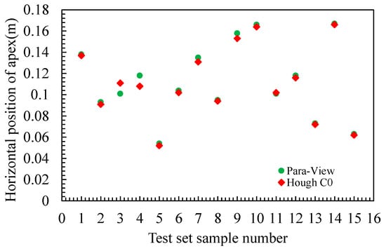 To get the specific position and value from ParaView, we load our simulation data and create the visualization. Then, we select the “Selection” tool, click on the “Pick Data” button, and select the point apex . In the “Properties” panel, we expand the “Information” section to view the X, Y, and Z coordinates of . To get the value of the data at the selected point, we expand the “Display” section and find the variable under “Cell Data” or “Point Data”. Finally, the value of the variable at the selected point will be displayed. As shown in Figure 7, there are two ways to compare apex , ParaView 5.6.0 (FDTD) and Hough contour recognition, calculated by the S equation. The solid blue line represents the outputs of the value in ParaView, and the red dashed line represents the calculated value of the contour recognition. A total of 15 samples were tested here, and the values of in the 2nd, 3rd, and 4th samples were slightly inaccurate. The two sets of data were very close. This proves the validity of the Hough transform combine with S equation method for detecting hyperbolic contours.