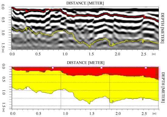 Soil stratification in GPR images (red color means the first soil layer, yellow color means the second soil layer).