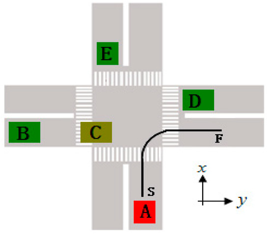 Figure 1 illustrates the single T-type active emergency steering strategy for preventing side collisions at crossroads. In the figure, A, B, C, D, and E represent vehicles in the lane. Taking vehicle A as an example, both vehicles A and C obey traffic rules and intend to pass a traffic intersection. If there is an imminent collision risk between vehicles A and C, vehicle A must perform active steering control to avoid colliding with vehicle C. Points S and F are the starting and endpoints of vehicle A, respectively. As per the coordinate system in Figure 1, the heading angle of the vehicle at point S is 0 degrees and at point F is 90 degrees. Thus, to complete the anti-collision T-type active emergency steering, vehicle A must brake and execute a 90-degree turning control in the shortest time.