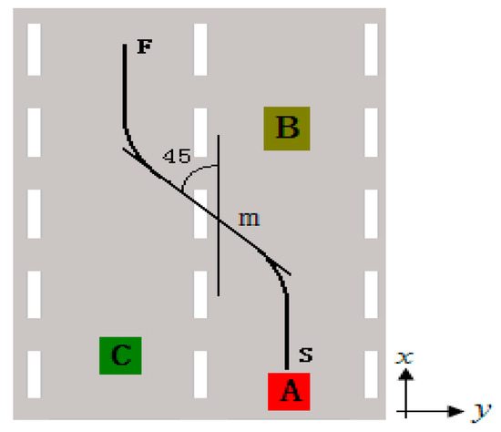 Figure 2 demonstrates the anti-collision double-T active emergency steering strategy, with A, B, and C representing vehicles in the lane. Taking vehicle A as an example, if there is an unavoidable rear-end collision between vehicle A and vehicle B, active steering control of vehicle A must be performed. The steering path in Figure 2 completes the anti-collision control from point S to point F through point m, encompassing two T-shaped steering controls. The path from point S to point m is a left turn T-shaped steering control, while the path from point m to point F is a right T-shaped steering control. According to the coordinate system in Figure 2, the vehicle’s heading angle at point S is 0 degrees, at point m is −45 degrees, and at point F is 0 degrees, completing the anti-collision active emergency steering control. Vehicle A achieves two T-turn steering controls in the shortest time following a straight driving period after braking.
