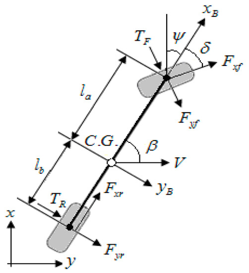 The vehicle dynamic model utilized in this study is a simplified single traction bicycle model [32], which encompasses three degrees of freedom: longitudinal motion, lateral motion, and yaw motion (Figure 3). Its dynamic differential equation is