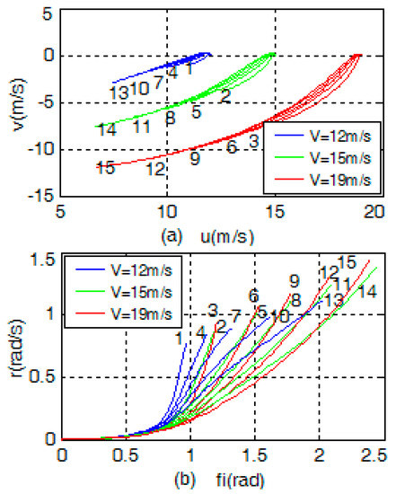 State diagrams for double-t-type steering with varying initial speeds: (a) the phase; (b) phase; (c) phase; (d) phase; (e) phase; (f) phase.