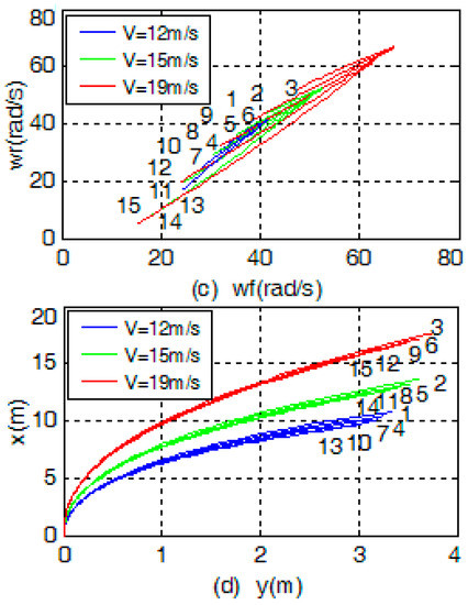 Considering initial vehicle speeds of 12 m/s, 15 m/s, and 19 m/s; conventional braking torques of 0, 200 Nm, 300 Nm, 400 Nm, and 500 Nm; and parking brake torques of 0, 100 Nm, 200 Nm, 300 Nm, and 400 Nm; the phase portrait of each state is obtained through simulation, as illustrated in Figure 4. Figure 4 shows the phase plan analysis of various initial vehicle speeds and braking torques for the anti-collision T-type emergency steering control strategy. The figure consists of four subplots, each depicting the relationship between two state variables: longitudinal speed and lateral speed, heading angle and yaw rate, front wheel angular velocity and rear wheel angular velocity, and longitudinal coordinate and lateral coordinate. Figure 4a displays the phase portrait; Figure 4b shows the phase portrait; Figure 4c presents the phase portrait; and Figure 4d reveals the phase portrait.