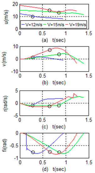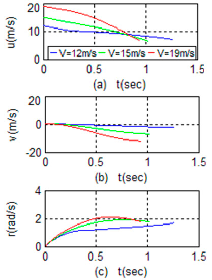 The simulation results of anti-collision T-type emergency steering at crossroads with three different initial vehicle speeds are displayed in Figure 5. The figure consists of six subplots, each depicting the relationship between one state variable and time: longitudinal speed, lateral speed, yaw rate, heading angle, front wheel angular velocity, and rear wheel angular velocity. The figure demonstrates how the state variables vary over time as the vehicle completes the T-type steering control under different initial speeds. Figure 5a demonstrates the relationship between longitudinal speed and time. Figure 5c indicates that the vehicle completes the T-turn at the maximum yaw rate. The vehicle’s final heading angle in Figure 5d is 1.57 rad (90°), which completes the 90° steering.