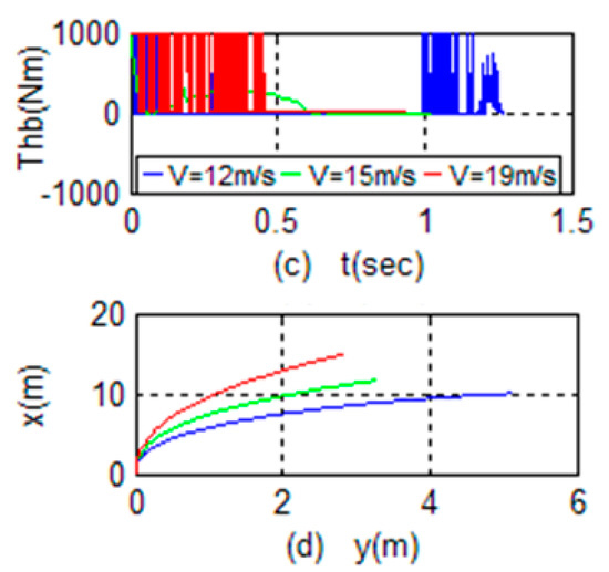 Figure 6a illustrates the relationship between wheel angle and time. Figure 6d reveals that the vehicle’s trajectory is turning right by 90°. Figure 5 and Figure 6 indicate that the minimum time to complete the T-type emergency steering is different at various initial vehicle speeds. The higher the initial vehicle speed is, the longer the turning time and the greater the vehicle travel distance are. The simulation results of the control variables are displayed in Figure 6. Figure 6b shows that conventional braking is in effect during the initial and final stages. Figure 6c demonstrates that the handbrake is fully functional at the initial stage. Figure 5f indicates that the rear wheels are almost locked, and the rear wheel angular velocity is significantly reduced. This leads to a deliberate loss of rear-wheel traction, often utilized by experienced drivers to initiate and maintain the vehicle’s rotational yaw operation. In this manner, the rear wheels are intentionally saturated, causing the force acting on the rear axle of the vehicle to disappear and resulting in an unstable factor that prompts rapid yaw rotation.