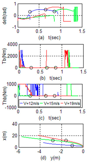 Table 2 presents the initial vehicle speed, final vehicle speed, initial heading angle, final heading angle, and steering end time (optimization time) values. The initial and final heading angle values indicate that the vehicles successfully complete their respective T-type steering control. The optimization time listed in Table 2 represents the minimum time required to complete the steering. Sensor devices can detect the positional relationship with the vehicle ahead and determine whether to activate T-type active emergency steering control. Millimeter-wave radar or LiDAR can be utilized to sense the vehicle in front and its location. Considering that the vehicle’s initial speed is not zero, the safe distance that can prevent a collision through normal braking should be calculated. If a collision cannot be avoided through normal braking, T-type active emergency steering control should be activated. The safety distance is typically calculated based on the maximum possible deceleration.