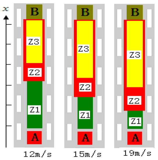 As depicted in Figure 9, zone Z1 (green) is a safe zone where normal braking can prevent collisions. Zone Z2 (red) represents the smallest area where normal braking is guaranteed not to collide. If the vehicle is in zone Z2, normal braking cannot avoid collisions. Zone Z3 (yellow) is the longitudinal distance of the anti-collision-T-type active emergency steering. In the Z2–Z3 zone, the strategy presented in this paper can be employed to prevent collisions. In other words, it is only in zone Z2 that the strategy can effectively prevent collisions, while in zone Z1, it is not necessary to initiate the strategy. As seen in Figure 9, the sizes of Z1, Z2, and Z3 vary with different initial vehicle speeds.