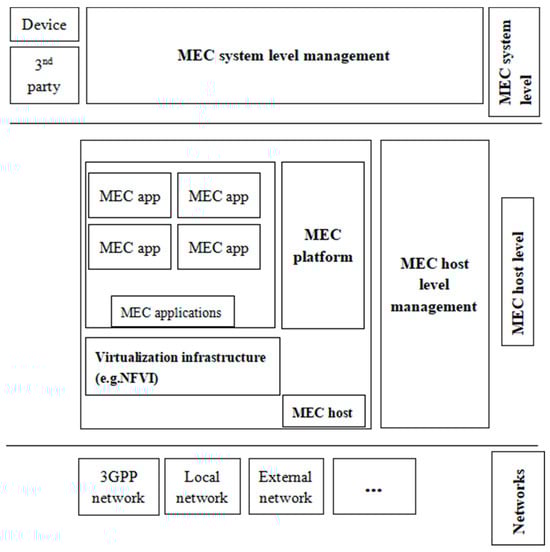 ETSA proposed a MEC architecture in 2014 to provide mobile devices (MDs) with an IT environment and cloud-computing capabilities under the radio access network (RAN) [,]. ETSA has defined the MEC reference architecture in the literature []. As shown in Figure 1, the reference architecture includes two layers of MEC: the host level and the MEC system level []. Among them, the MEC host level is composed of a virtualized infrastructure manager, a MEC platform manager, and a MEC host. The MEC system level includes operator support systems, user application life-cycle management agents and MEC orchestrators. In addition, there is also a network level under the MEC system, which mainly includes local networks, external networks, third-generation cooperation plan (3GP) cellular networks and related external entities representing the access situation of the MEC system and the local area network, external access network or cellular mobile network []. Naouri, et al. [] proposed a three-layer task offloading framework, which is composed of a device layer, cloudlet layer, and cloud layer, which can achieve high performance compared with advanced computing offloading technology.