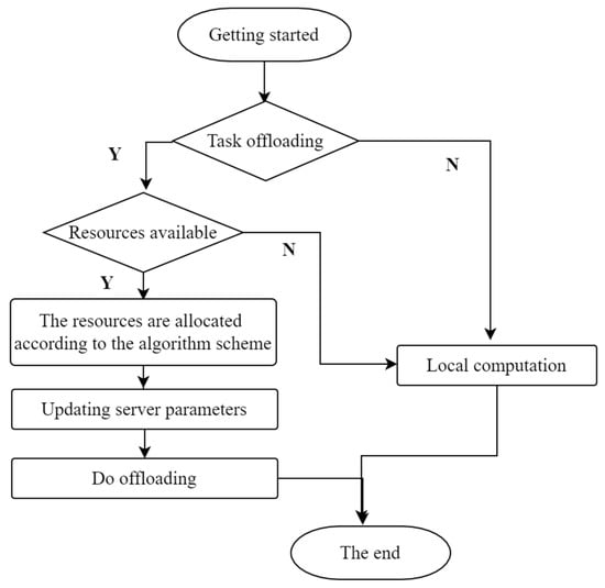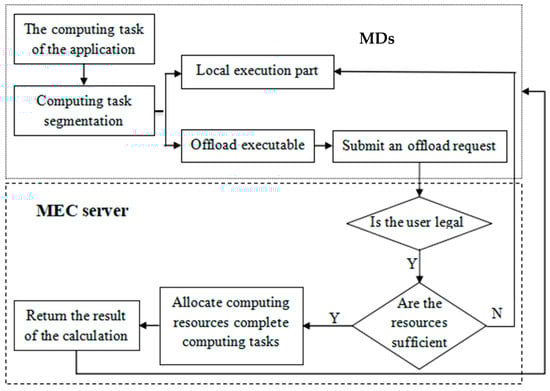 Computing offloading is a process of migrating computing tasks on MDs to the extended cloud or grid platforms, assisting terminal devices to complete user task requests, and returning computing results to designated devices []. In the MEC system, users use the MEC server as an intermediary to call the computing power closer to the local area for data processing, thus avoiding the traditional way of transmitting data to a remote central cloud for processing []. The flowchart of the MEC system computing offload is shown in Figure 3. A computing task can be executed locally or at the edge server. Local execution requires the mobile device itself to perform the computation of the task and output the result of the computation. The remote execution first needs to submit an offloading request, and the MEC server judges the validity of the user of the service: If the user is valid, the MEC server allocates computing resources to the user according to the resource usage and the user task data volume, and updates the computing resources and the system energy consumption status; if the user is illegal, the service cannot be provided. The server completes the tasks uploaded by the mobile device according to the allocated computing resources and returns the computing results to the device side.