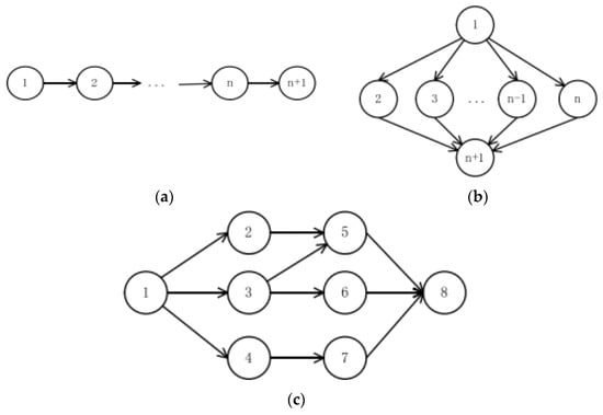In the study of computing task offloading of MEC system, there are three relationships among multiple computing tasks of data shareable or code shareable applications, namely, sequential dependent tasks, parallel dependent tasks, and general dependent tasks. Their respective topological relationships are shown in Figure 5 [].