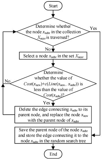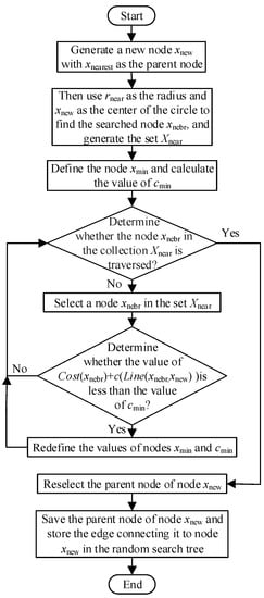 Step 4: If node in the set is not traversed, select a node in the set to determine whether the value of is less than the value of . If it is less than , the values of the nodes and are redefined, and then the iterations within the collection continue. If greater than , then continue traversing within the set. If the node in the collection has been traversed, reselect the parent node of node , save the parent node of node and store its connection edge with node in the random search tree.