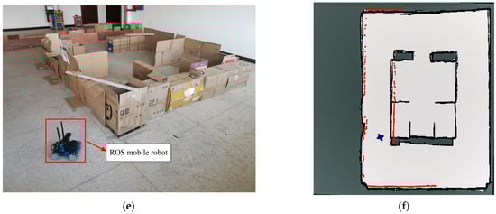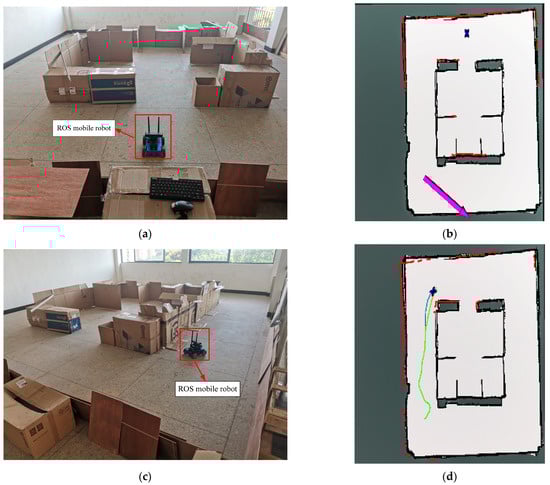 The mobile robot was initially located directly above the actual obstacle scene, as shown in Figure 7a, which was navigated by the two different path planning algorithms in actual scene 1. The algorithm operation effects in the beginning, middle and final stages of navigation in this scene are presented in Figure 7a,c,e, respectively, and their display effects in the visualization tool RViz are exhibited in Figure 7b,d,f, respectively.