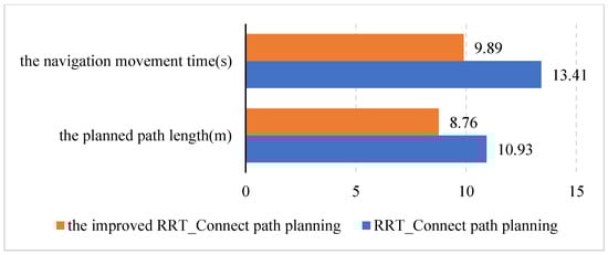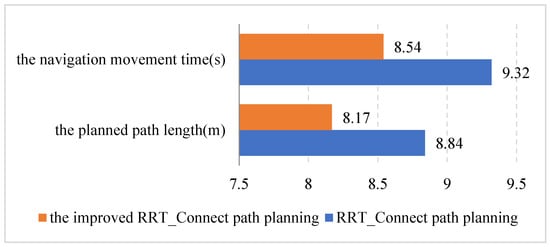 Besides, the navigation movement time and the planned path length in actual scene 1 obtained by the two different path planning algorithms were recorded for performance comparison. According to the results in Figure 8, in actual scene 1, the navigation movement time and the planned path length obtained by the improved RRT_Connect algorithm were reduced by 0.78 s and 0.67 m, respectively, in contrast with those of the traditional one. In general, the improved RRT_Connect algorithm outperformed the traditional one in path planning.