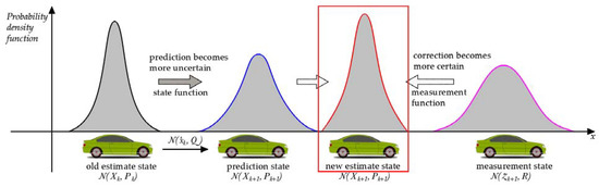When the KF filter algorithm is used to predict the vehicle trajectory, it is divided into two parts: one is the vehicle position probability distribution predicted by the state equation, and the other is the vehicle position probability distribution obtained by the measurement equation. The standard weighted Gaussian integral of the function is calculated using the third-order volume integral principle, and the two parts of the probability distribution are fused to obtain the predicted probability distribution of the vehicle position at the next moment. The schematic diagram of the filtering algorithm is shown in Figure 1 [16].