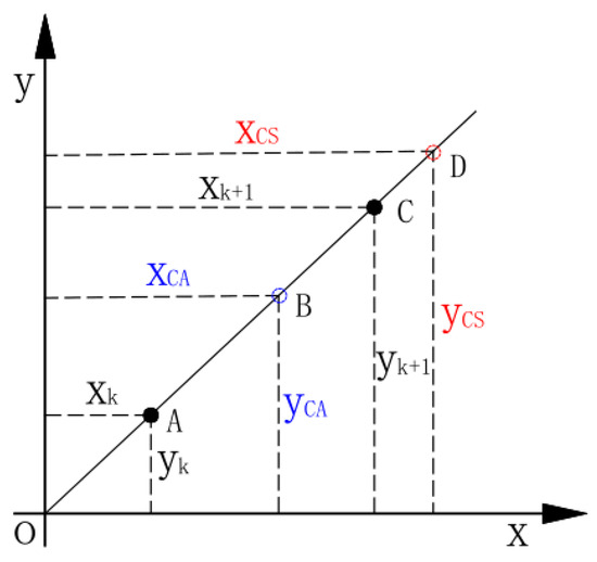 Figure 2 shows the difference in the two vehicles’ motion states. In the two-dimensional Cartesian coordinate system, the sampling interval is T, assuming that the target is a particle and ignoring the influence of the overall size of the target on the motion state. Point A in the figure represents the position of the moving target at the time . At this time, the state variable of the vehicle can be expressed as , and each parameter represents the position, velocity, and acceleration of the target on the x-axis and y-axis. At the moment, the actual position of the vehicle is point C, and the state variable can be expressed as . Points B and D represent the vehicle position estimated by the CA model and CS model at the moment, respectively.