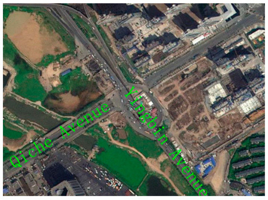 The method of CA-UKF, CS-UKF, and CS-CKF (this paper proposed) models are applied to track and predict the vehicle maneuvering state. As the intersection is a high incidence place of traffic accidents, tracking the vehicle trajectory in the intersection has more practical importance [22]. We selected the intersection of Yingbin Avenue crossed Qiche Avenue in Nanchang as the research object. The proposed method is applied to predict the vehicle trajectory by the Matlab program. In order to compare the performance of tracking prediction, the CA-UKF, and CS-UKF models are also applied. The intersection scene is shown in Figure 4.