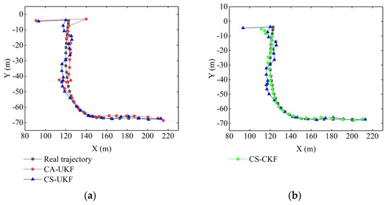 Tracking results. (a) Tracking results of CA-UKF and CS-UKF. (b) Tracking results of CS-UKF and CS-CKF.