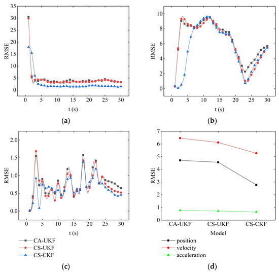 Figure 7b,c shows the RMSEs of predicted velocity and acceleration, respectively. From the numerical distribution, the error of CS-UKF and CS-CKF is smaller than that of CA-UKF. Judging from the range of data variation, the overall stability of CS-UKF and CS-CKF is slightly better than that of CA-UKF model. Therefore, the CS model has superior prediction accuracy and stability than the CA model when predicting the vehicle trajectory because “varying acceleration” is more suitable for the real state of vehicle motion. When the CS model is used as the basis of prediction model, the errors of the two models are similar. Figure 7d and the variation of the mean motion target RMSE in Table 1 show that the combined CS-CKF model outperforms the other two models in predicting the three performance metrics of position, velocity, and acceleration. Therefore, the CS-CKF model has superior estimation accuracy in vehicle trajectory prediction.