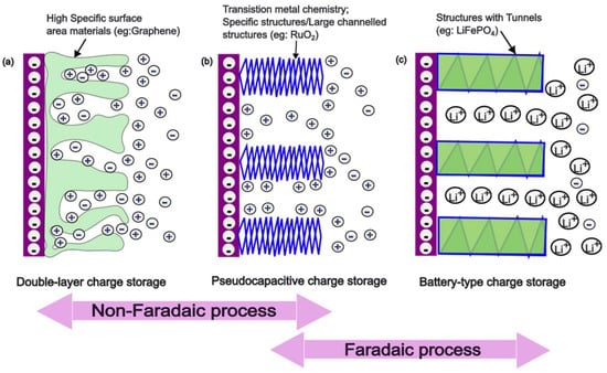 Supercapacitors can be categorized according to their charge mechanisms as EDLC, pseudo-capacitance and battery type behaviors, as shown in Figure 2. The physical process of accumulating charges on an electrode surface governs the behavior of EDLCs, resulting in good reversibility with a long cycle life. EDLCs utilize reversible adsorption/desorption of ions at the electrode/electrolyte interface. Active carbon is normally used as the electrode. High performance EDLC design requires electrode materials with high specific surface area, large porosity and proper pore distribution, as its performance depends on the electrochemical activity and kinetics of the electrodes []. Pseudo-capacitance is based on Faradic redox reactions, intercalation and electrosorption [,]. Surface redox pseudo-capacitance relates to the Faradaic charge transfer between electrode and electroactive ions of the electrolyte at the electrolyte–electrode interface. The second pseudo-capacitance mechanism involves reversible intercalation/deintercalation of ions into the crystal structure of the electrode material. The Faradaic reactions result in the formation of a reversible monolayer on the surface of the electrode [,,,]. Pseudocapacitance is also achieved when a monolayer is formed from the cations on the electrode surface, known as underpotential deposition []. It is important to note that no material phase change occurs in pseudo-capacitance mechanisms []. Metal oxides such as RuO2 and MnO2 are conventionally used as pseudo-capacitive materials [,], but also include metal hydroxides, transition-metal chalcogenides, transition-metal nitrides, conductive polymers, perovskites, polyoxometalates, transition-metal oxides and transition-metal selenides [,].