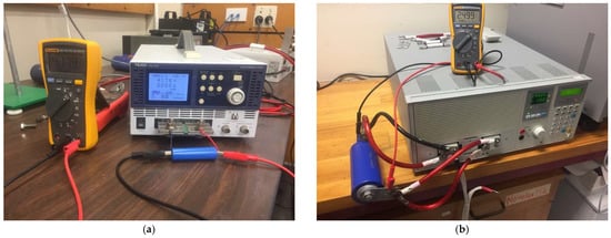 Two different DC loads were used to obtain the performance characteristics of the devices. To explore the high current capabilities of the supercapacitors, the 1200 W Chroma 6314 A, capable of up to 240 A, was used. A secondary 300 W capable TEXIO PXL-151 A, capable of handling 150 A, was used for the Li-ion battery due to its comparatively lower current capability. The experimental setup is shown in Figure 4.