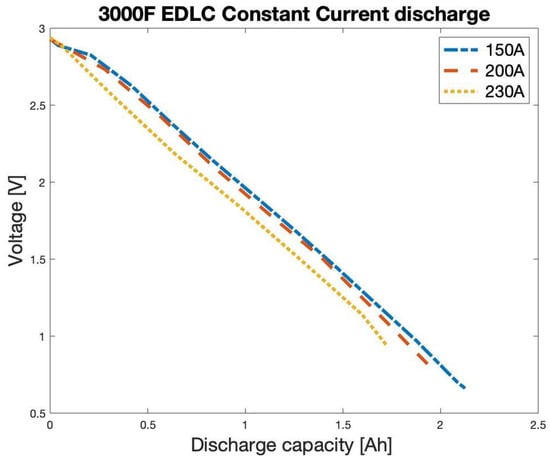 The constant current discharge of a SAMWHATM 7500F hybrid capacitor is shown in Figure 6. This is an asymmetrical supercapacitor consisting of a Lithium Titanium Oxide (LTO) or Lithium Manganese Oxide LMO anode and an activated carbon cathode. The energy storage is achieved with a mixture of a Li+ intercalation–deintercalation process and an electrostatic absorbing process due to the electric double layer. As a result, the energy density has increased compared with an EDLC supercapacitor but has a lower life charge–discharge life cycle. It has an operational range of 2.8–1.6 V. The cutoff region of 1.6 V, according to the manufacturer, is due to the operational voltage of the LTO electrode being 1.55 V. Here as well, we have the 10% tolerance of capacitance and the discharge capacity varying from 2.25 to 2.75 Ah, which can be approximated by Equation (1).