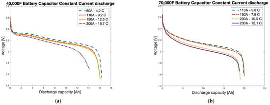 Battery capacitor discharge curve: (a) 40,000F (high power type); (b) 70,000F (high energy type).