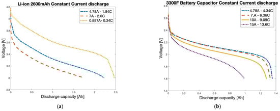 The performance of a 2600 mAh 18,650 Li-ion battery by PowertechTM was compared with a 3300F battery capacitor, shown in Figure 8. From the discharge curves, we can infer that the hybrid and battery capacitor type supercapacitors follow a profile like that of Li-ion batteries. When the Li-ion battery discharges at higher C-rates, it loses capacity, while the battery capacitor remains closer to its specified 1.1 Ah capacity at a wider range of C-rates.