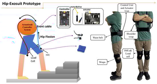 With progress in science and technology, a growing number of wearable lower limb exosuits have emerged, including those for assisting daily functions such as walking and running [1,2]. Some researchers are also investigating how to identify different terrains for exosuit control with depth cameras to further enhance the usefulness and versatility of exosuits [3]. At the same time, researchers are constantly optimizing and improving the actuator of the exoskeleton system. Jung-Wook Suh et al. [4,5] mentioned a harmonious nonlinear cable actuation structure to mechanically provide the required cable actuation length without increasing the number of actuators. During the use of the exoskeleton robot, higher stresses cause damage to the entire robot structure. To solve this problem, Ref. [6] proposed a fish-tail-inspired method to optimize the stress distribution along the serial compliant joints. The team then used 3D topological optimization techniques to optimize the robot’s flexure joints and enhance the torsional stiffness of the continuum robot [7]. With the application and development of the aforementioned technologies in the field of exoskeletons, exoskeletons can better assist the wearers in their daily life. Stair climbing is also a demanding physical activity that is often performed as part of a daily routine. Considering that many countries are experiencing a rapid increase in the population of elderly people, an exosuit that can help elderly people with ascending stairs becomes important [8]. The exosuit should work in the real world, and must be lightweight, have an independent power supply, be easy to wear, etc. The exosuit should also have high safety and reliability, because the exosuit directly acts on the human body [9]. Therefore, the choice of a soft exosuit as an aid has advantages over a rigid exoskeleton [10].