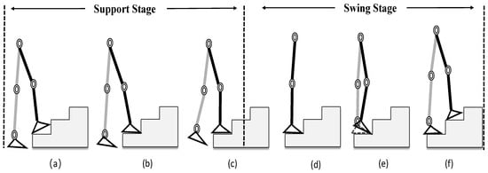 Schematic diagram of the division of a single gait cycle up the stairs. (a–e) stand for heel landing (HL), foot flat (FF), heel off the ground (HOG),toe off the ground (TOG) and heel landing again (HLA), respectively. (f) represents the beginning of the next phase.