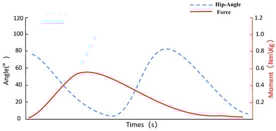 Andriacchi et al. and Livingston et al. reported that subjects required greater hip flexion to climb stairs. The maximum hip flexion occurred from 60.45% to 100% of the gait cycle [28,29]. The maximum average hip angle was 65.06 and the maximum hip extension moment was 0.76 (Nm/kg) when going up stairs [29]. Because a soft exosuit does not interfere with the wearer’s gait when providing assistance, the hip joint angle can be used as a basis to provide appropriate and real-time assistance such as the lower extremity exosuit [30]. In this paper, an algorithm is designed to generate the auxiliary force trajectory. The gait phase on the stairs is divided into several phase points (based on hip joint angle) [31], as shown in Figure 3.