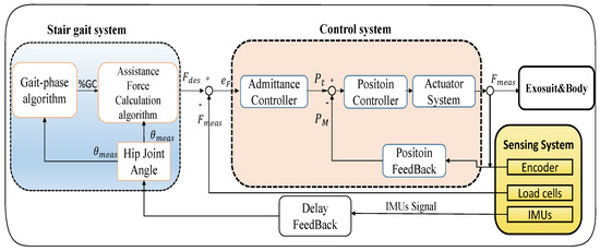 Compared to traditional industrial robots, the lower-limb exosuit robots are have multi-input and multi-output mechanisms with high uncertainty and nonlinearity, thus placing high demands on the control capabilities of the motors. Cao et al. improved the iterative learning approach and used a hierarchical control strategy to control the soft exosuit [21]. Chen et al. simplified the iterative learning control strategy [32]. In this exosuit system, the iterative learning control strategy is simplified and the admittance delay feedback strategy is added. Based on the admittance control, the corresponding delay feedback control is further added. Delayed feedback can handle sudden changes in gait when the height of the staircase changes, allowing the soft exosuit to generate more accurate auxiliary force control. The soft exosuit control system is shown in Figure 4. The proportional differential (PD) admittance controller can improve the performance of the exosuit control system. The PD admittance controller formula is as shown in Equation (2):